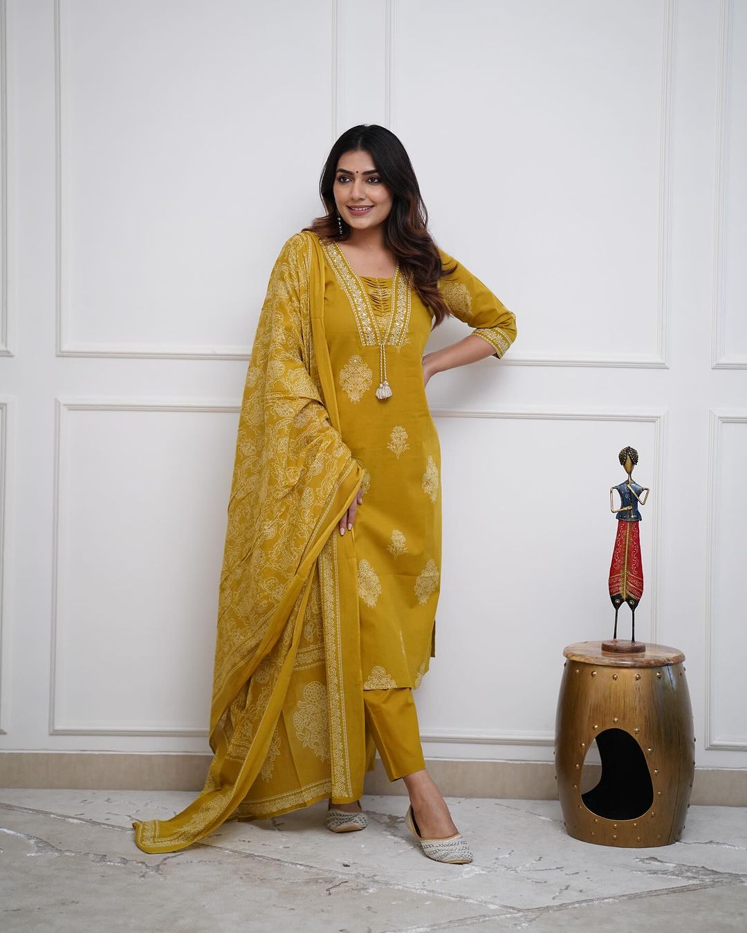 MUSTERED COTTON KURTA PANT WITH DUPATTA