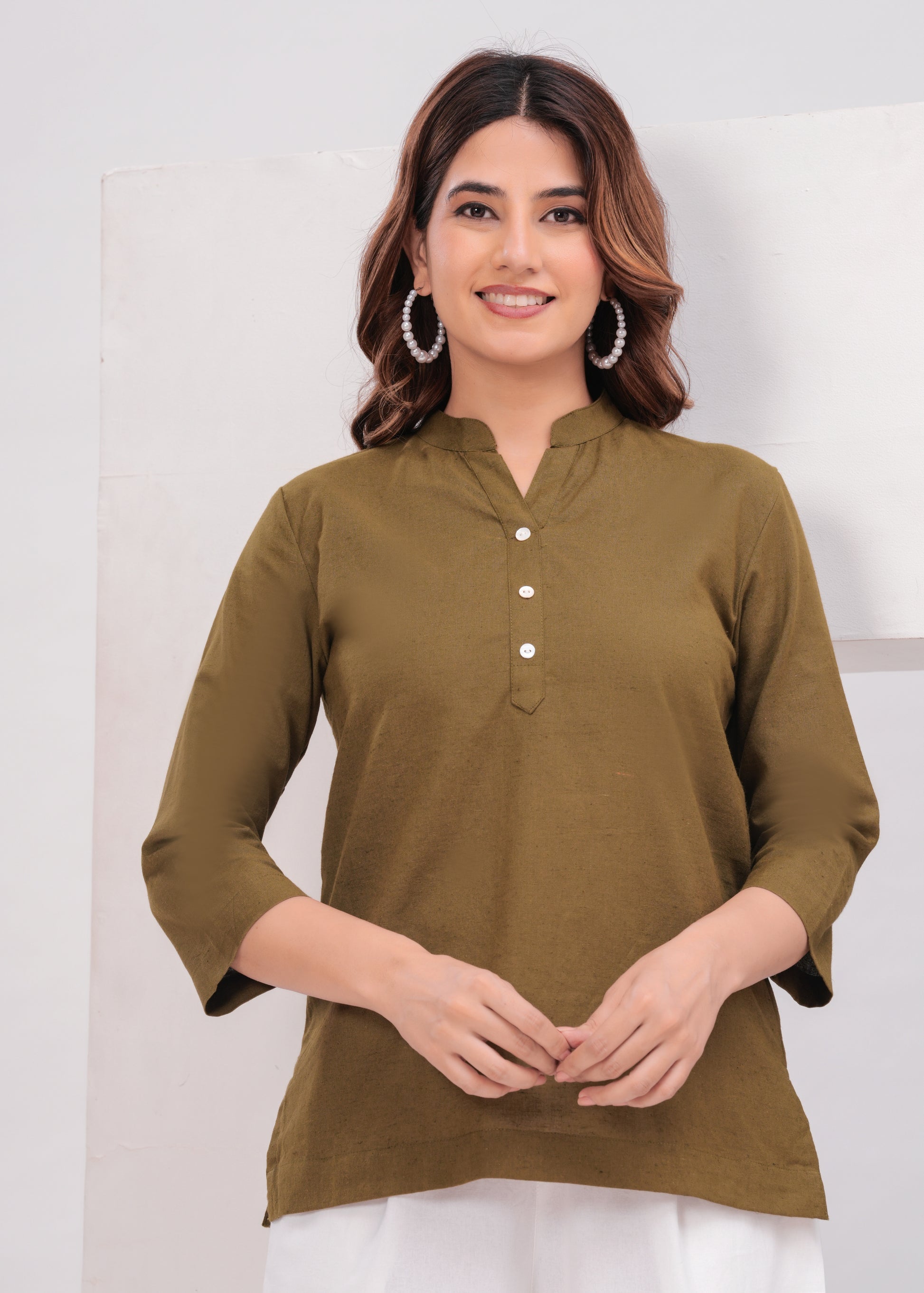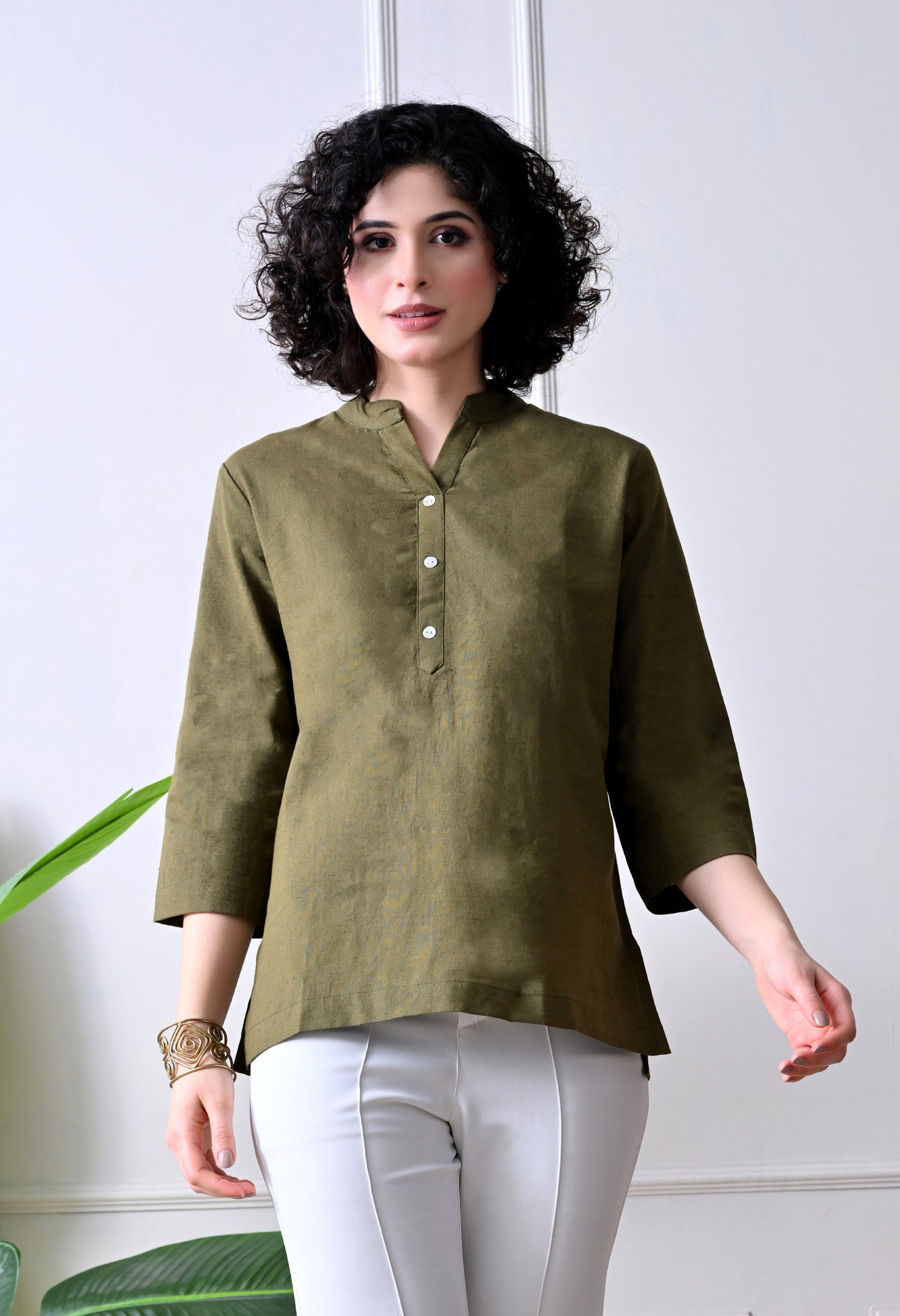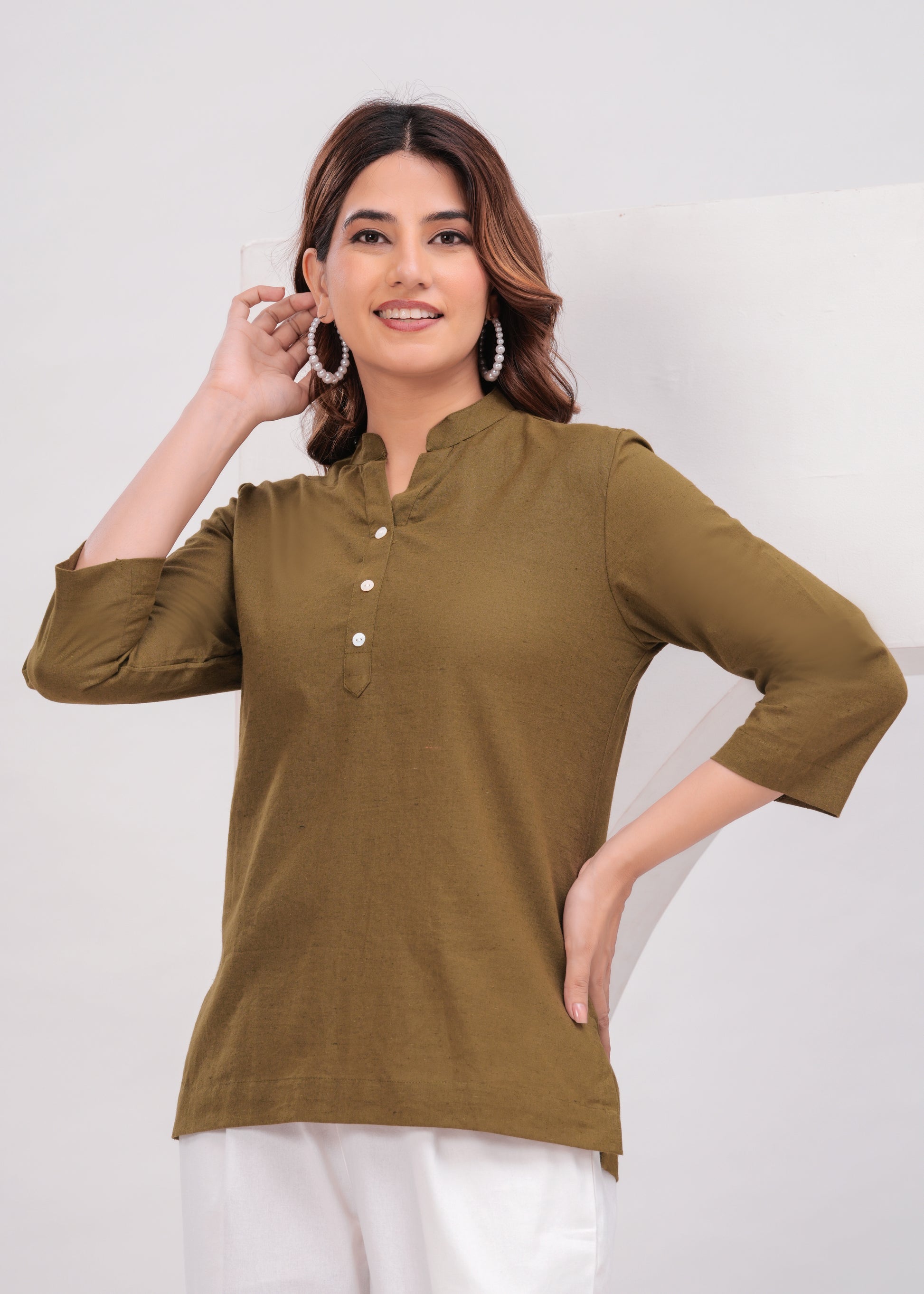 Olive Green Airy Solid Linen Comfortable Short Kurta