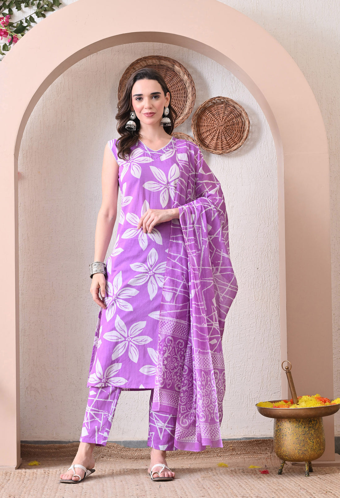 VBA Purple Sleeveless Cotton Kurta Pent Dupatta Set
