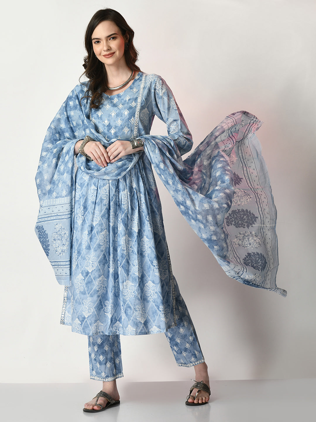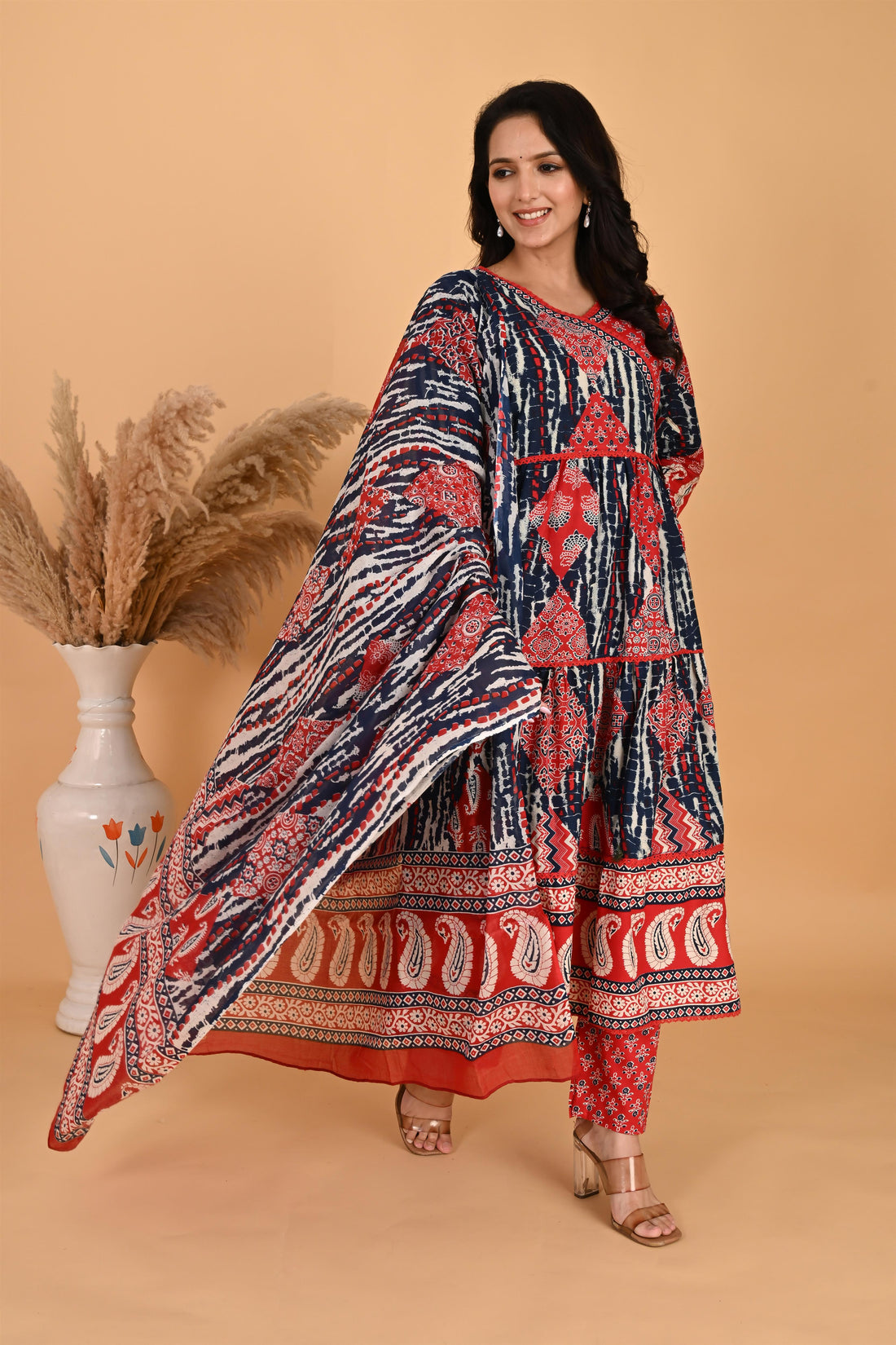 Blue and Red Cotton Anarkali Pant With Dupatta